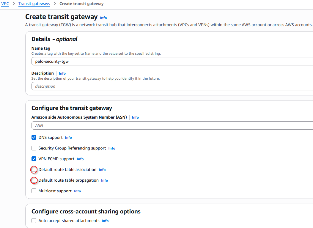 - Disable Default Route Table Association: This prevents new VPCs from automatically joining a global routing domain.