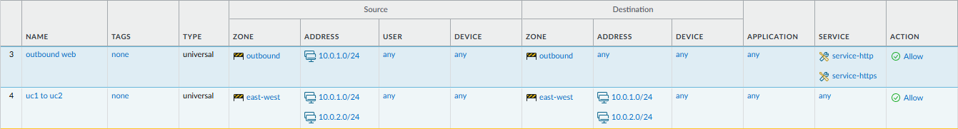 For this example I will allow all east to west communication and only allow UC1 web access to the internet.