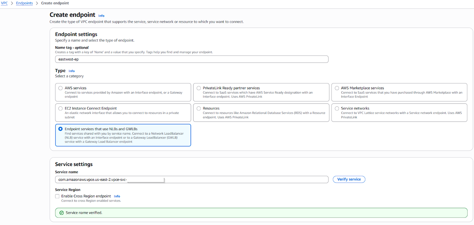 - Service Name: Paste the name copied in Step 1 and click Verify. Once verified it will show the available AZs and subnets select the appropriate ones.