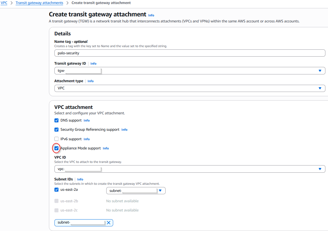 For Multi-AZ each attachment must have Appliance mode enabled. This ensures symmetrical traffic for our Palo Altos. In this single-AZ lab, it isn’t strictly required to prevent drops, but it is easier to enable it from day one so your architecture is ready to scale.