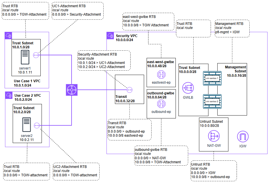 - Security VPC (TGW Subnet): The RTB points 0.0.0.0/0 to the GWLBe.